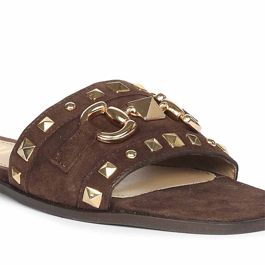 A strong, structured silhouette meets bold hardware detailing in this statement slide. Crafted in dark brown suede leather, the wide strap is accented with pyramid studs and finished with a striking horsebit trim at the center. The contrast between the soft suede and polished metal elements gives the pair a confident edge.