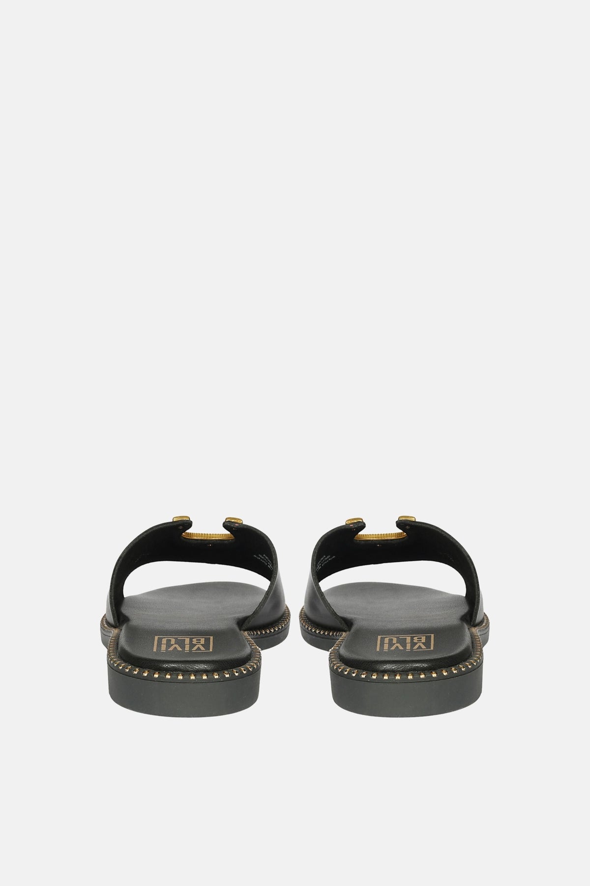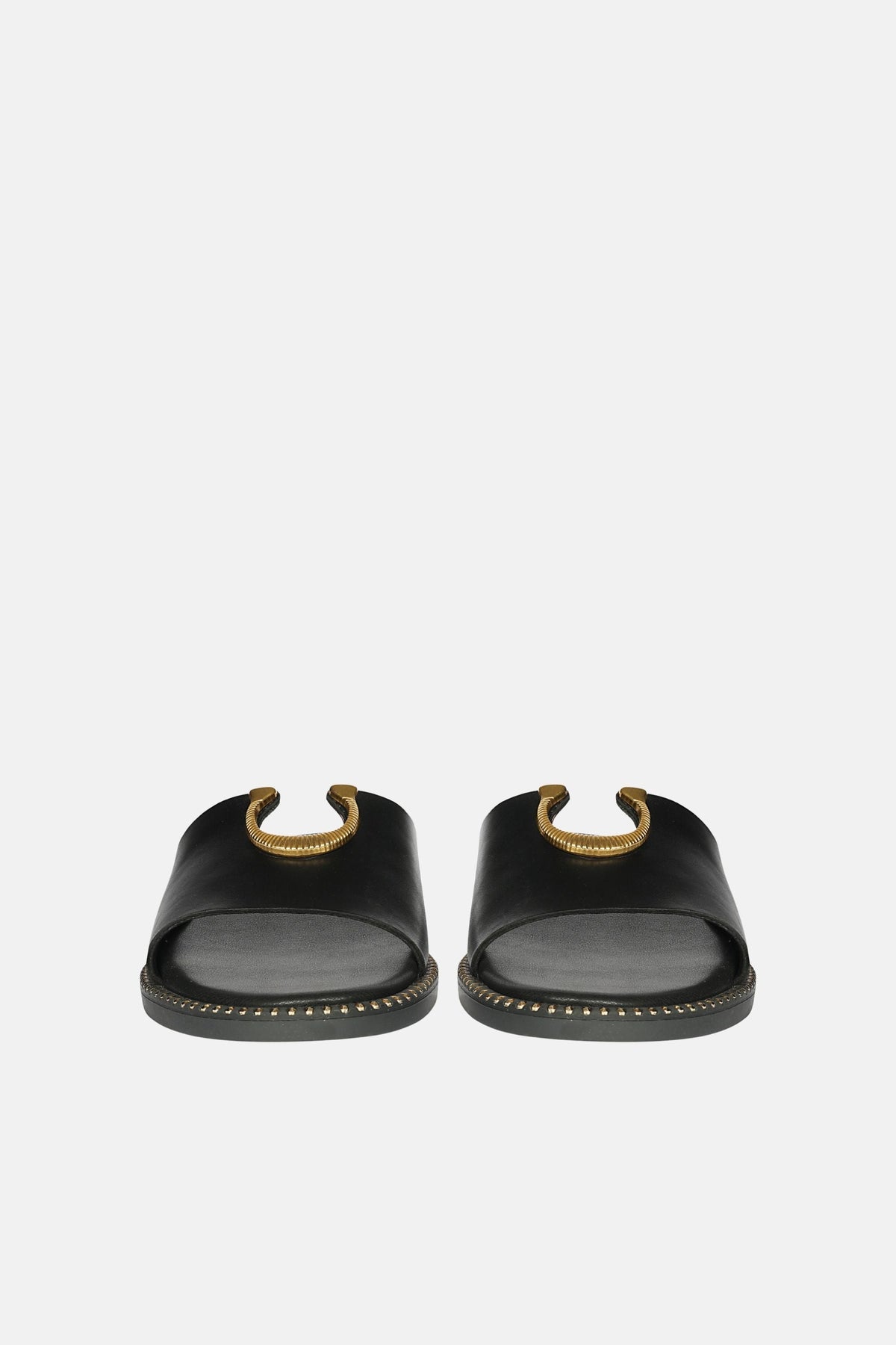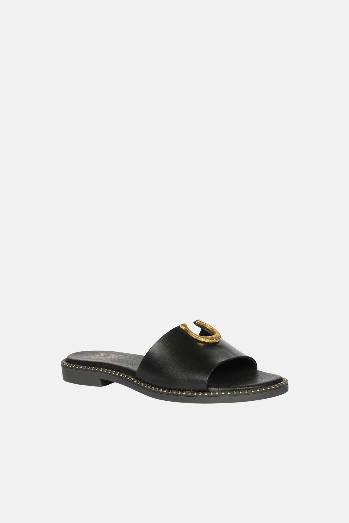 The Gold Horse Shoe trim is a refined interpretation of luminous sophistication. Crafted from black color genuine leather upper and lined with luxurious PU material for a premium feel. This slip on slide complete with a round toe and padded footbed. The perfect addition to your summer look to take it from day off to dive worthy.