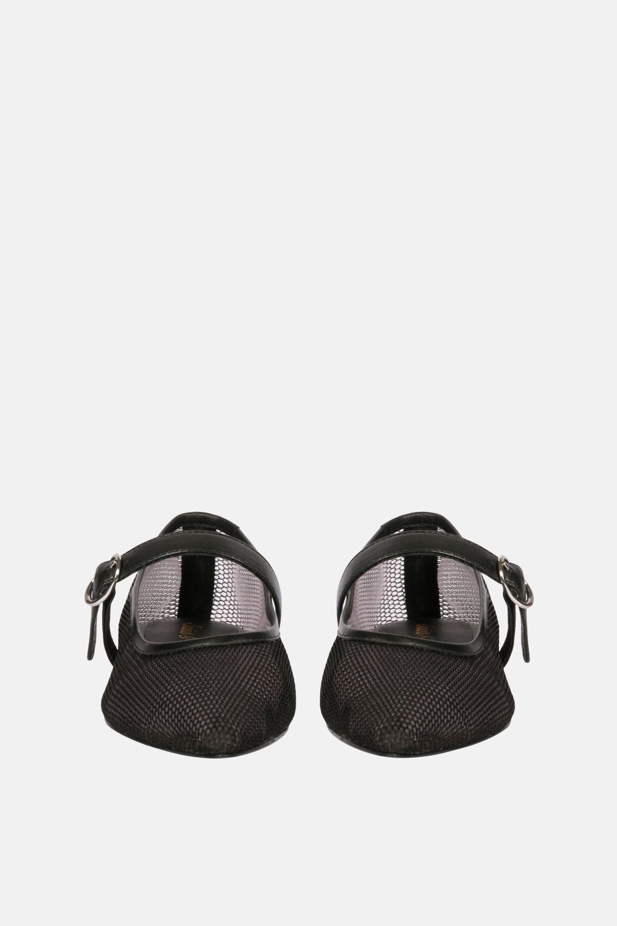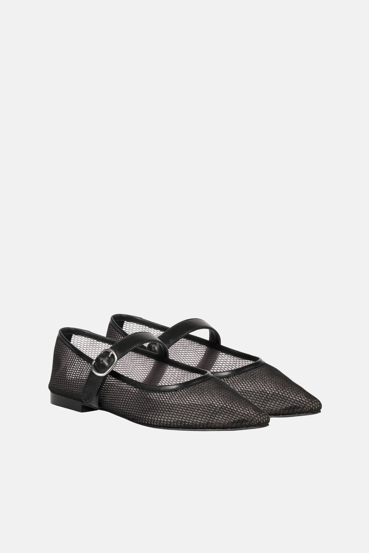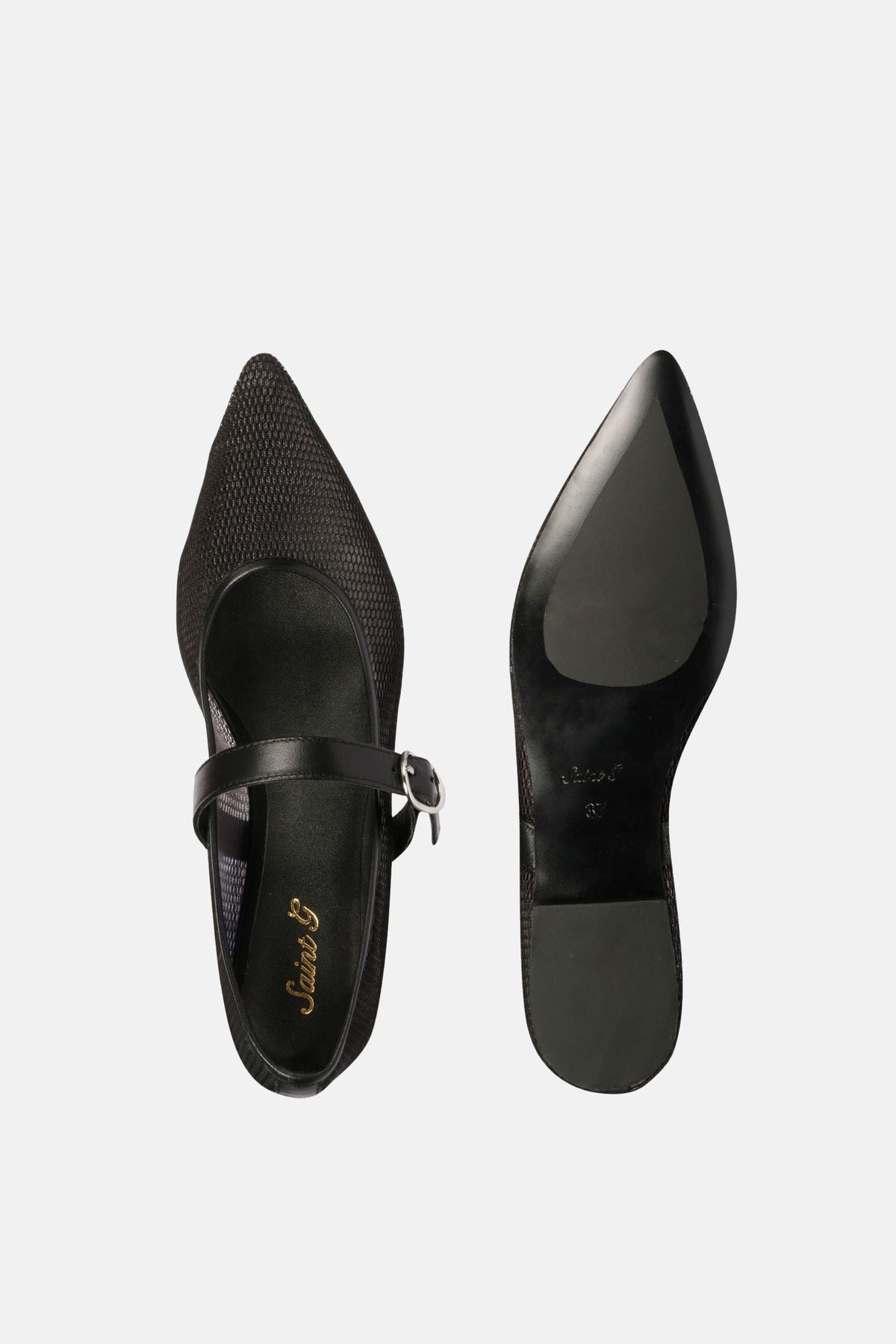 Elevate your shoe collection with the Saint G Patent Black Leather Mesh Buckle Pointy Toe Ballerina—where contemporary elegance and everyday comfort meet.