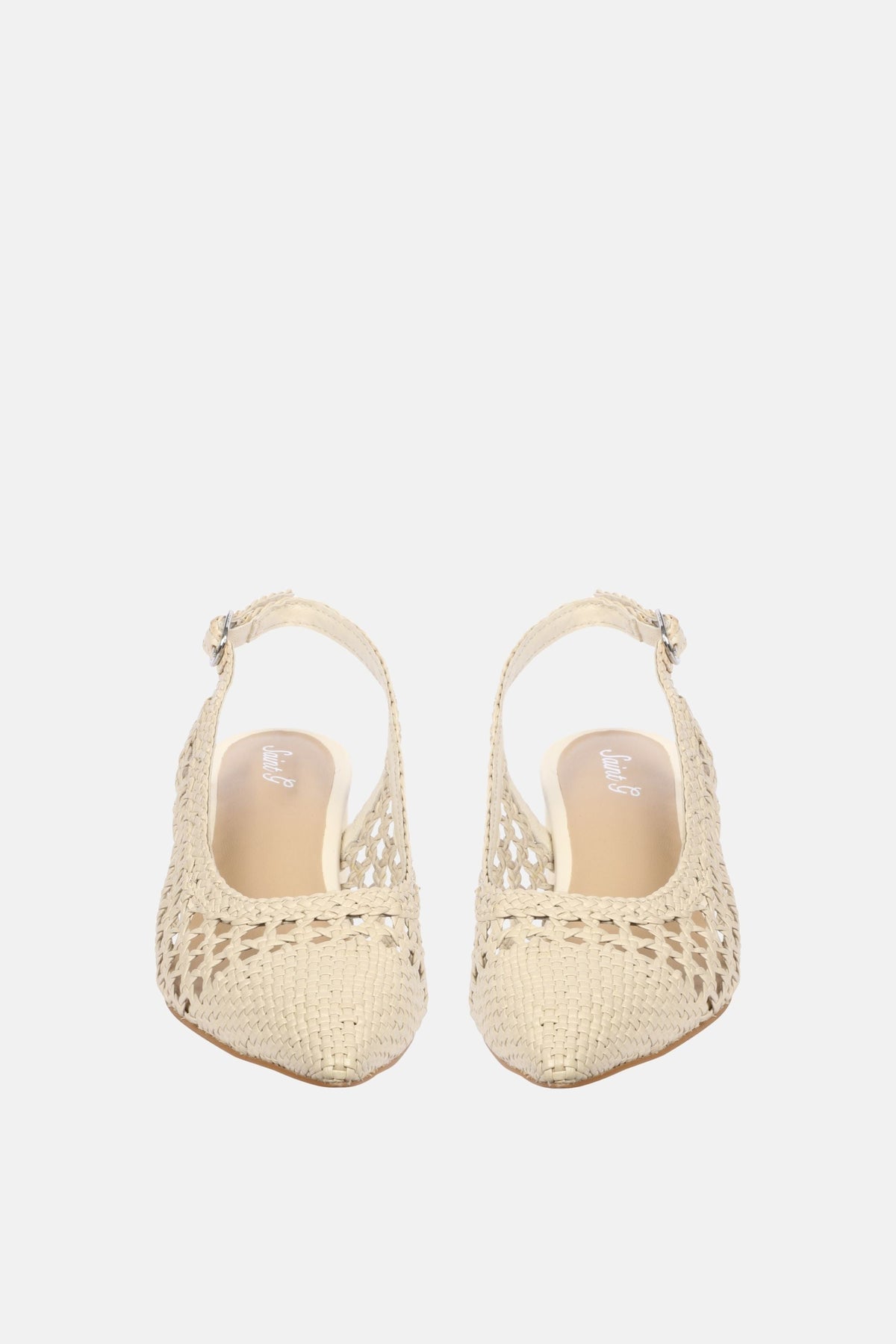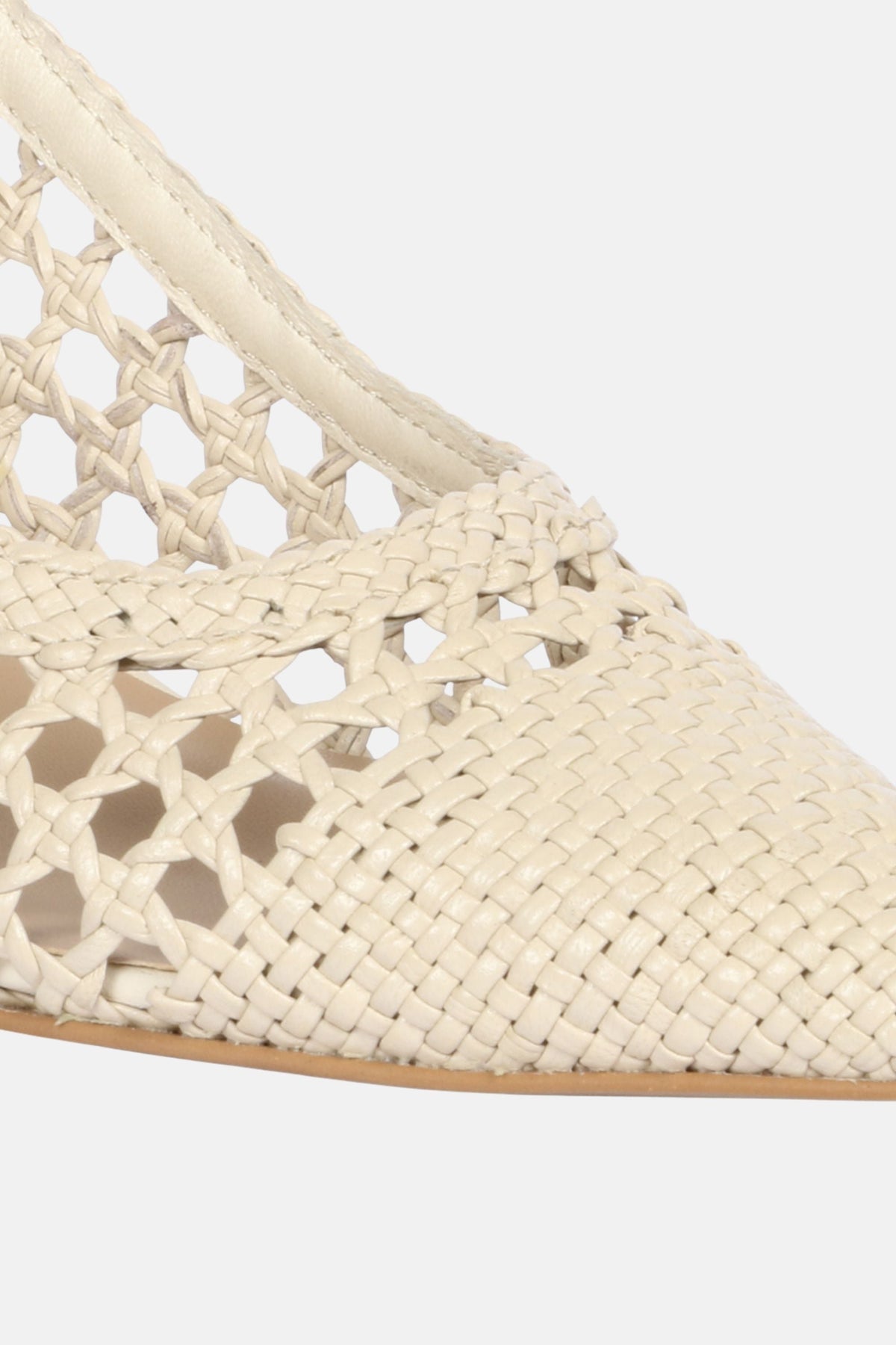 Grow your stylish wardrobe with a pair of hand woven ivory leather heel from SaintG. A high-coverage style featuring a statement woven upper and an edgy pointed toe and a mid block heel. Woven features and a walkable heel make it so desirable. It comes with a leather covered heel and padded leather footbed for natural comfort and breathability. This buckle fastening strap heel will lend a stylish look to your outfit.