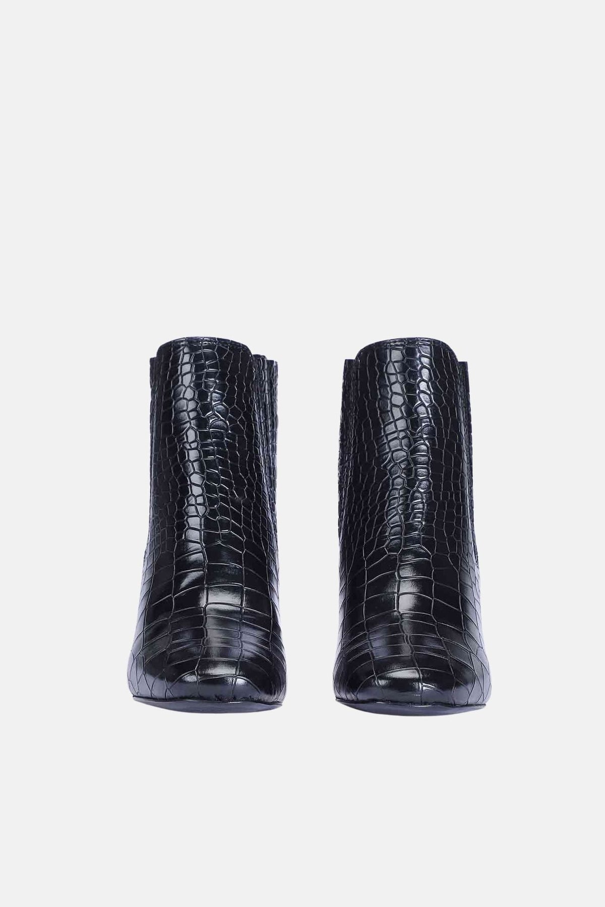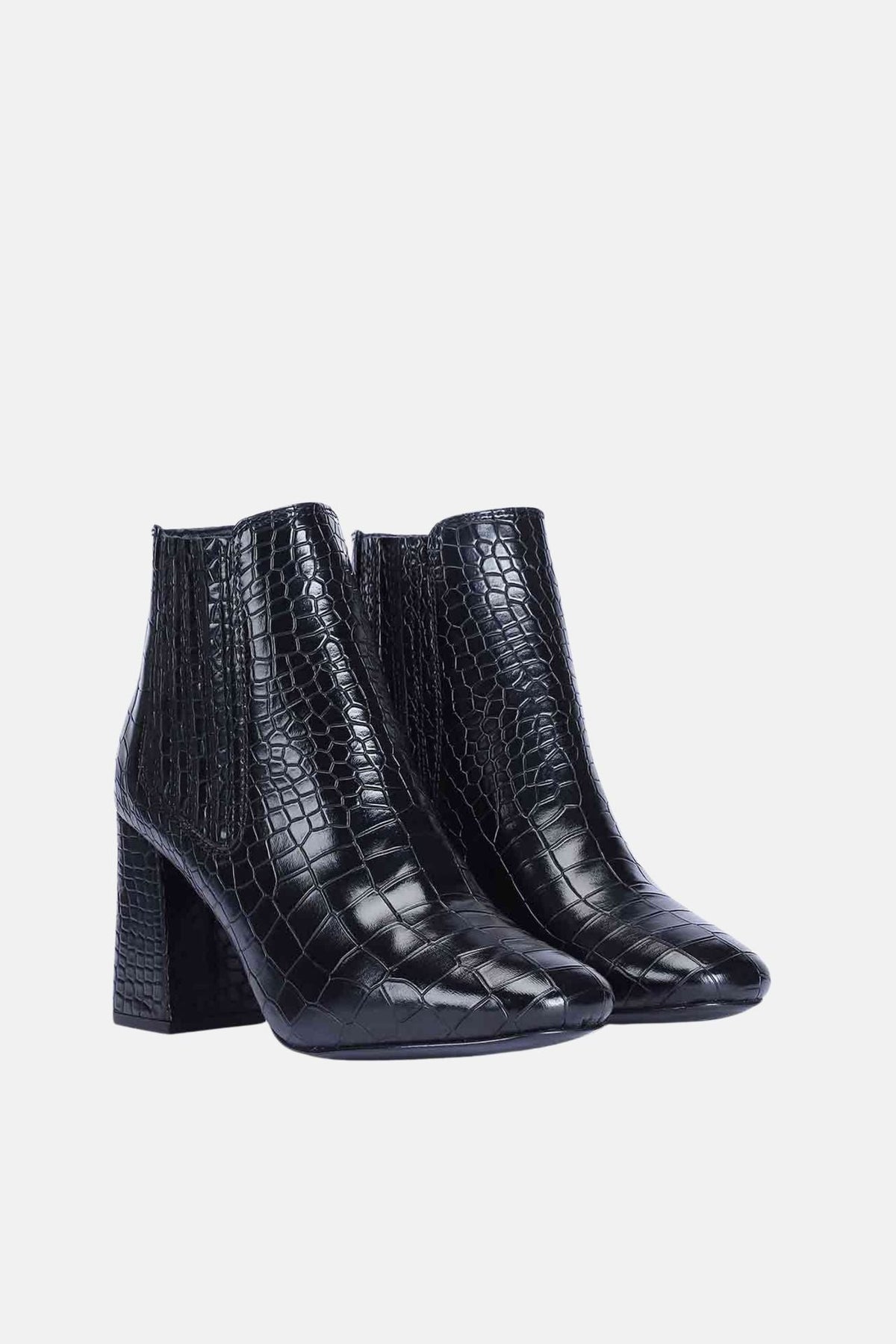Step into sophistication with the Saint Edwina Black Ankle Boots. Crafted with care from high-quality vegan leather, these ankle boots are the epitome of style and comfort. With their versatile croc embossed design, they can elevate any outfit, from casual jeans to elegant dresses.