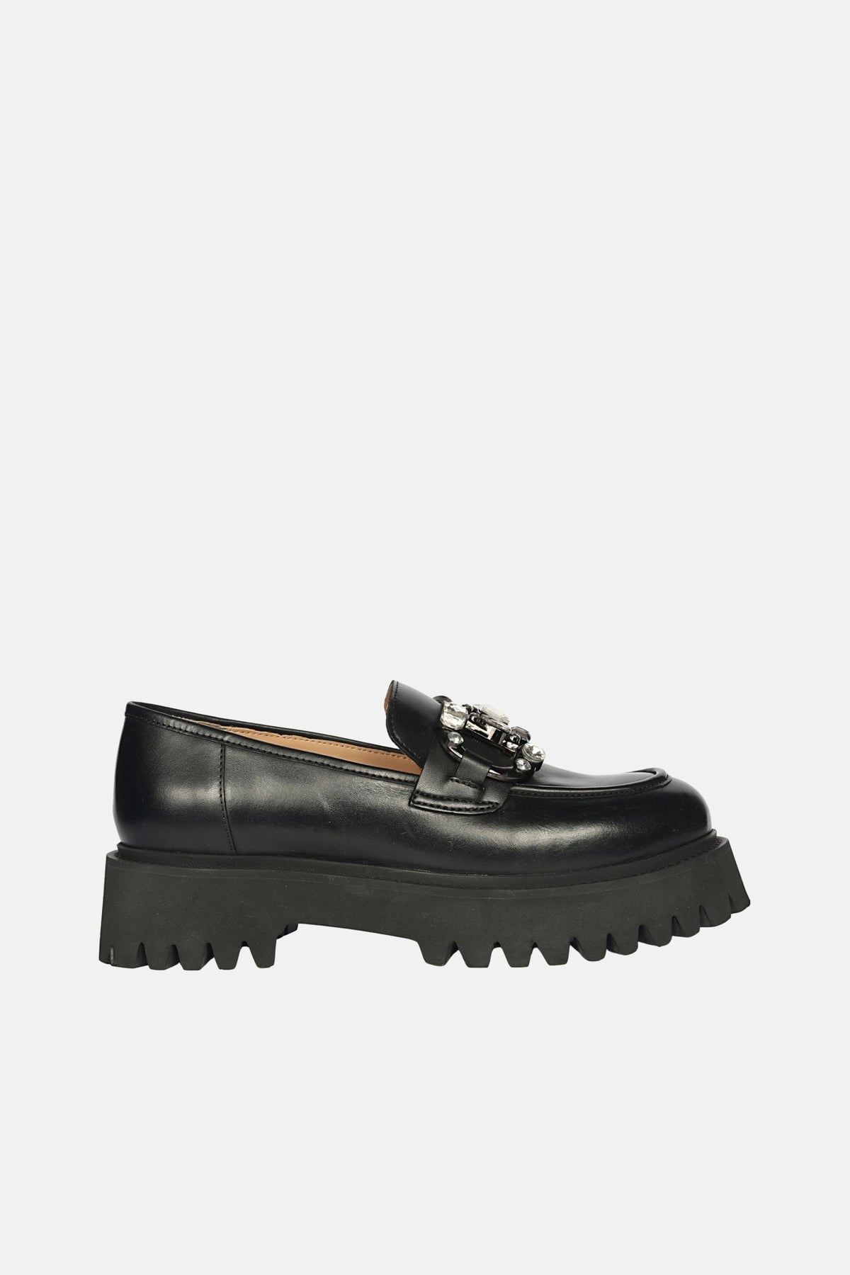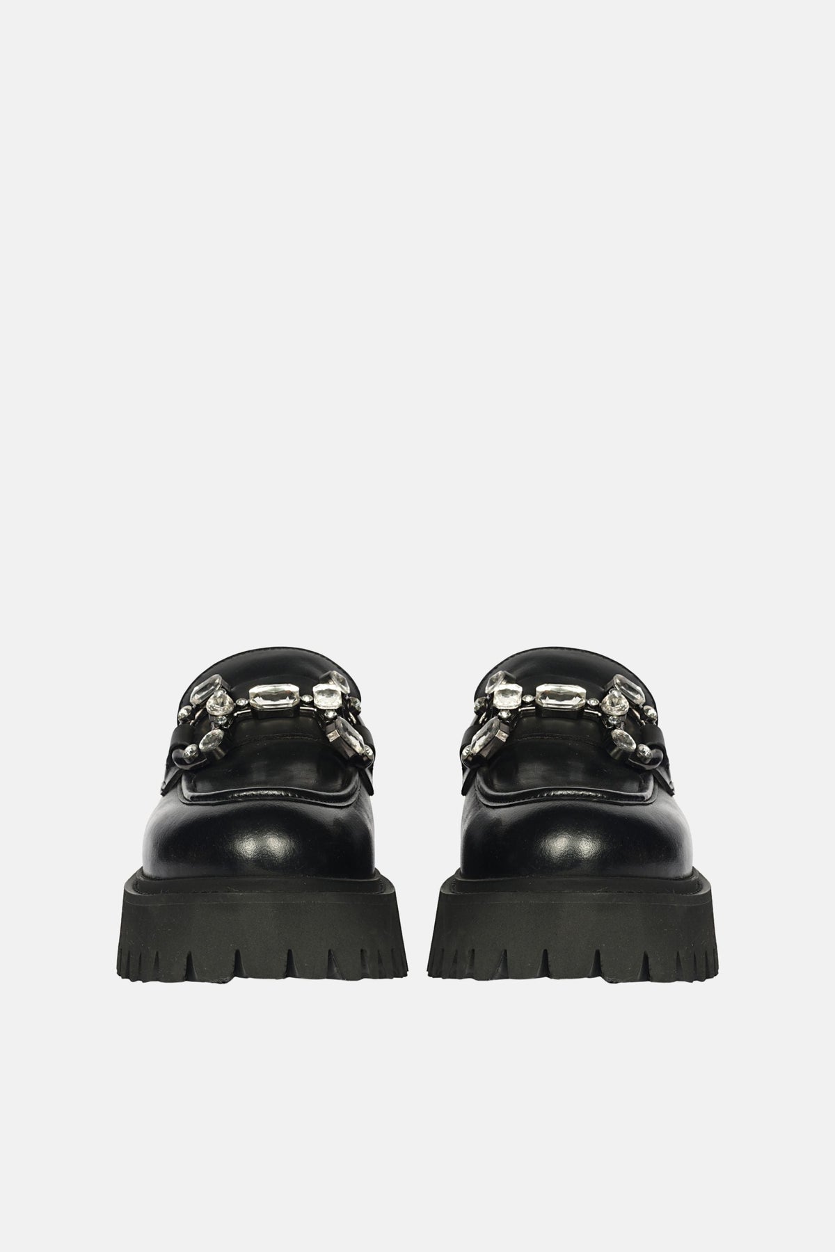 Glamour with grit. The FERI moccasins are crafted in rich black crust leather, elevated by a sculptural saddle trim adorned with transparent crystals in gunmetal casing. Set on a black EVA sole and lined in premium natural PU, this pair blends bold shine with all-day comfort. Finished with signature SaintG insole branding: made to stand out, never blend in.