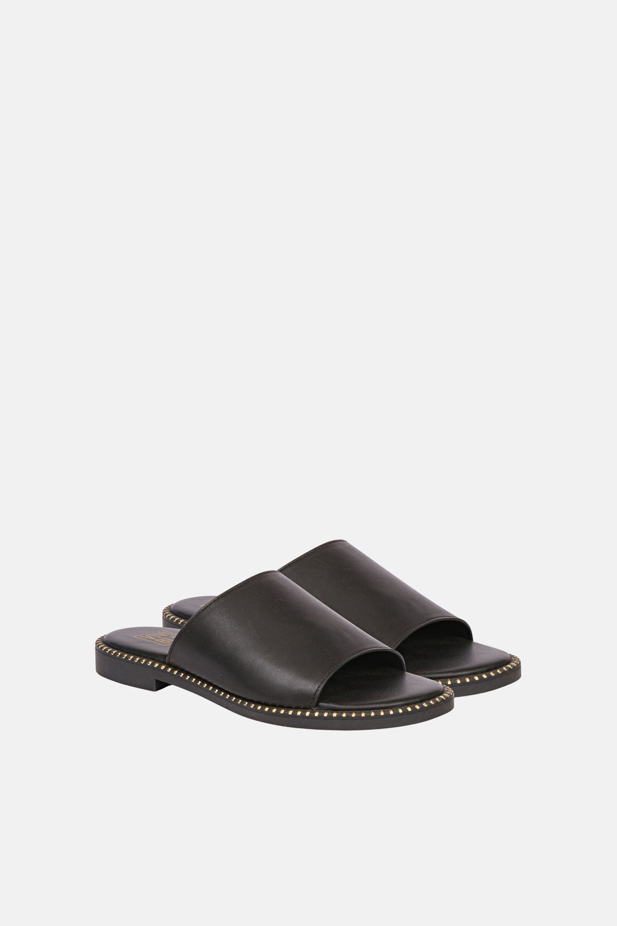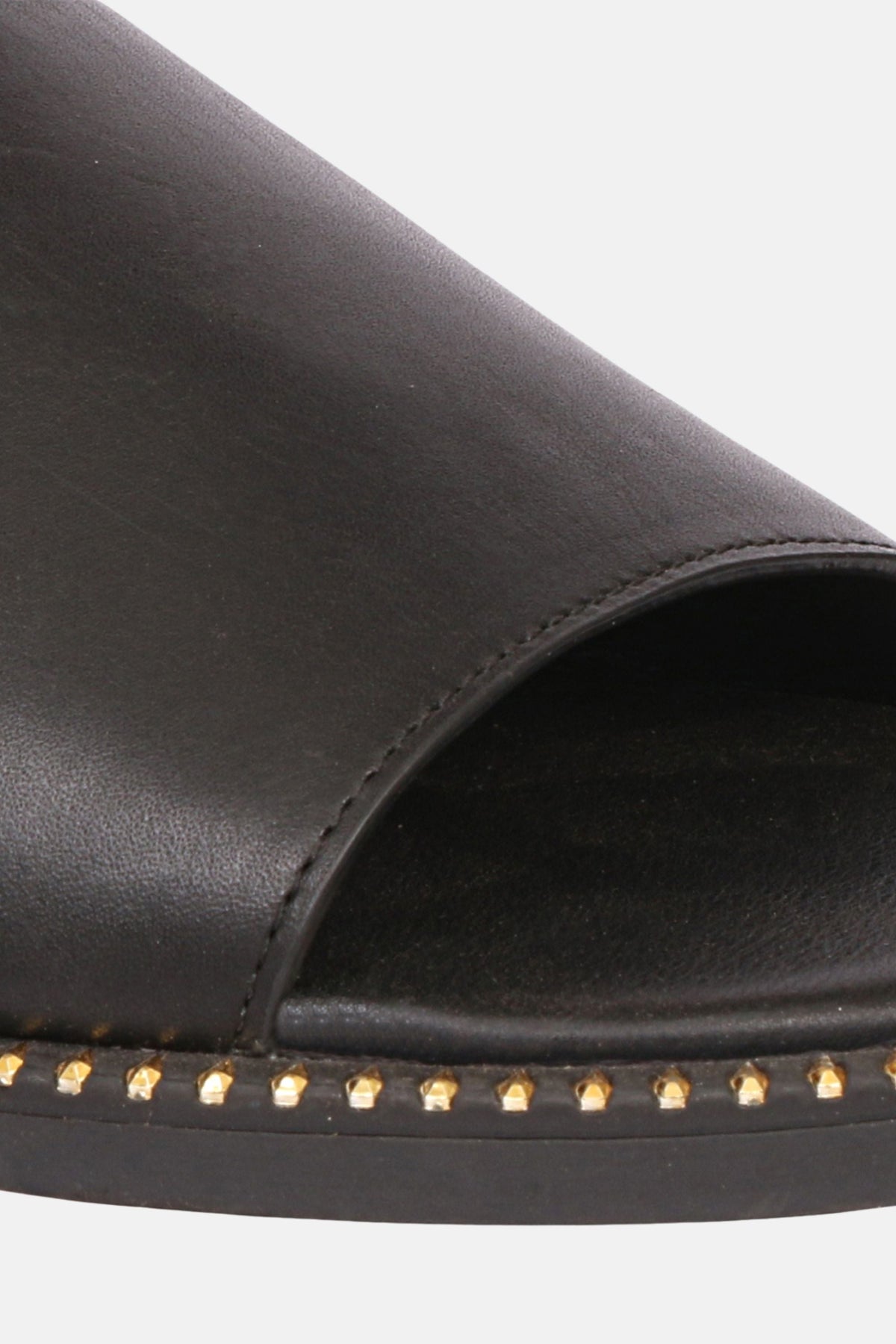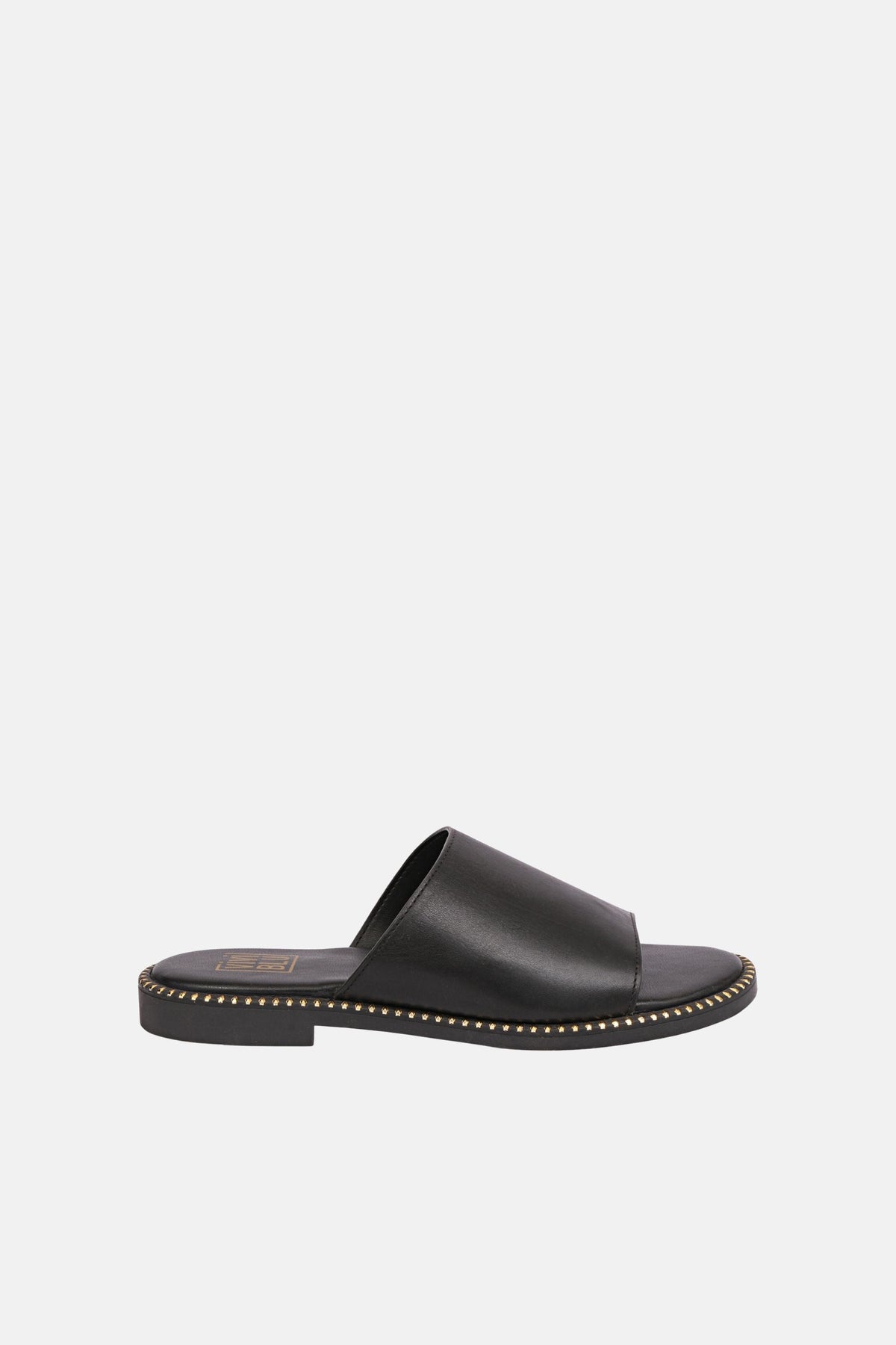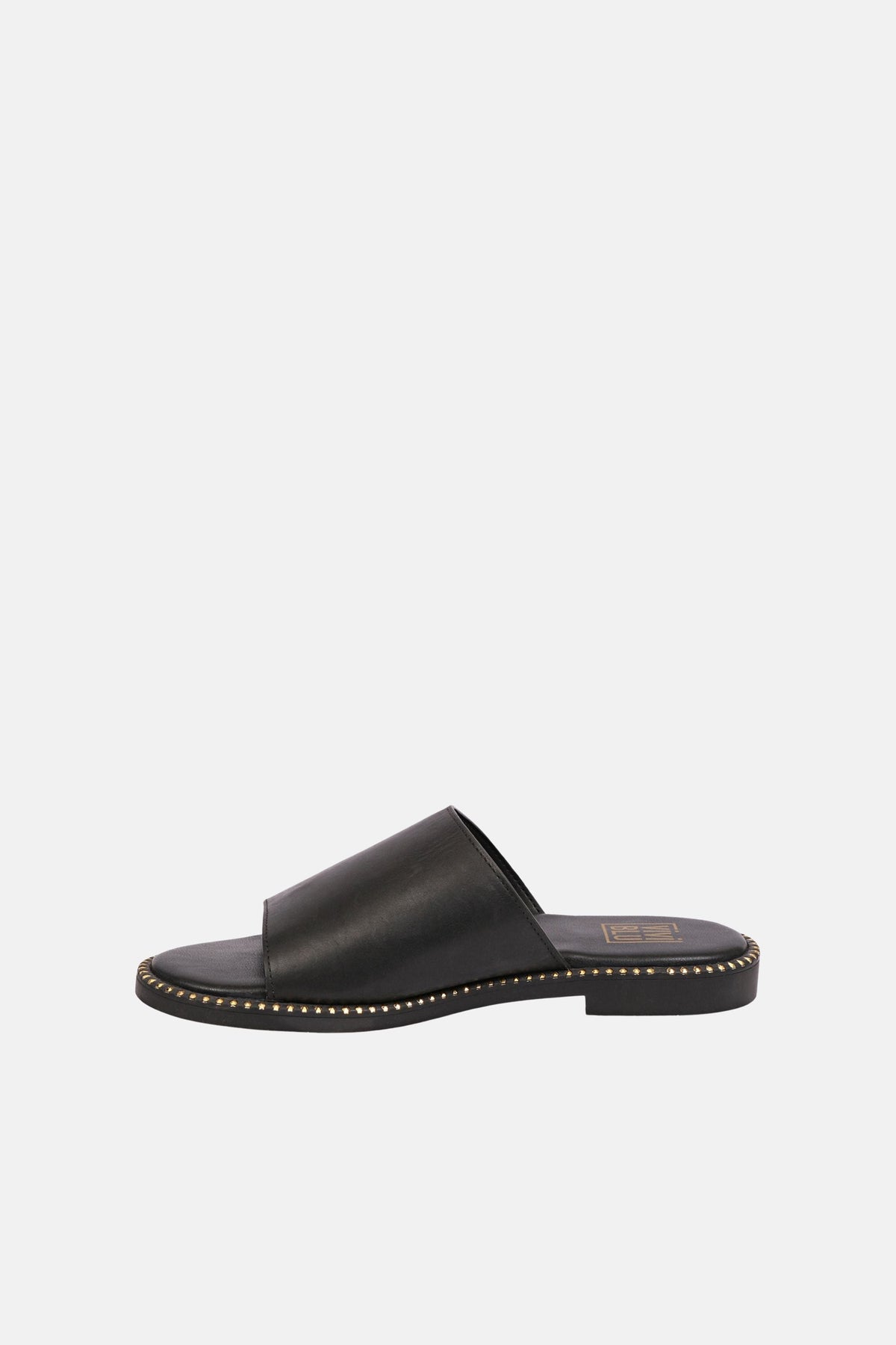 Indulge in the premium luxury of the Kalina Black Leather Sandals. Crafted from smooth leather, these sandals feature a padded insole and decorative studs along the edge of the sole, offering both comfort and style. Perfect for adding a touch of glam to any summer outfit!