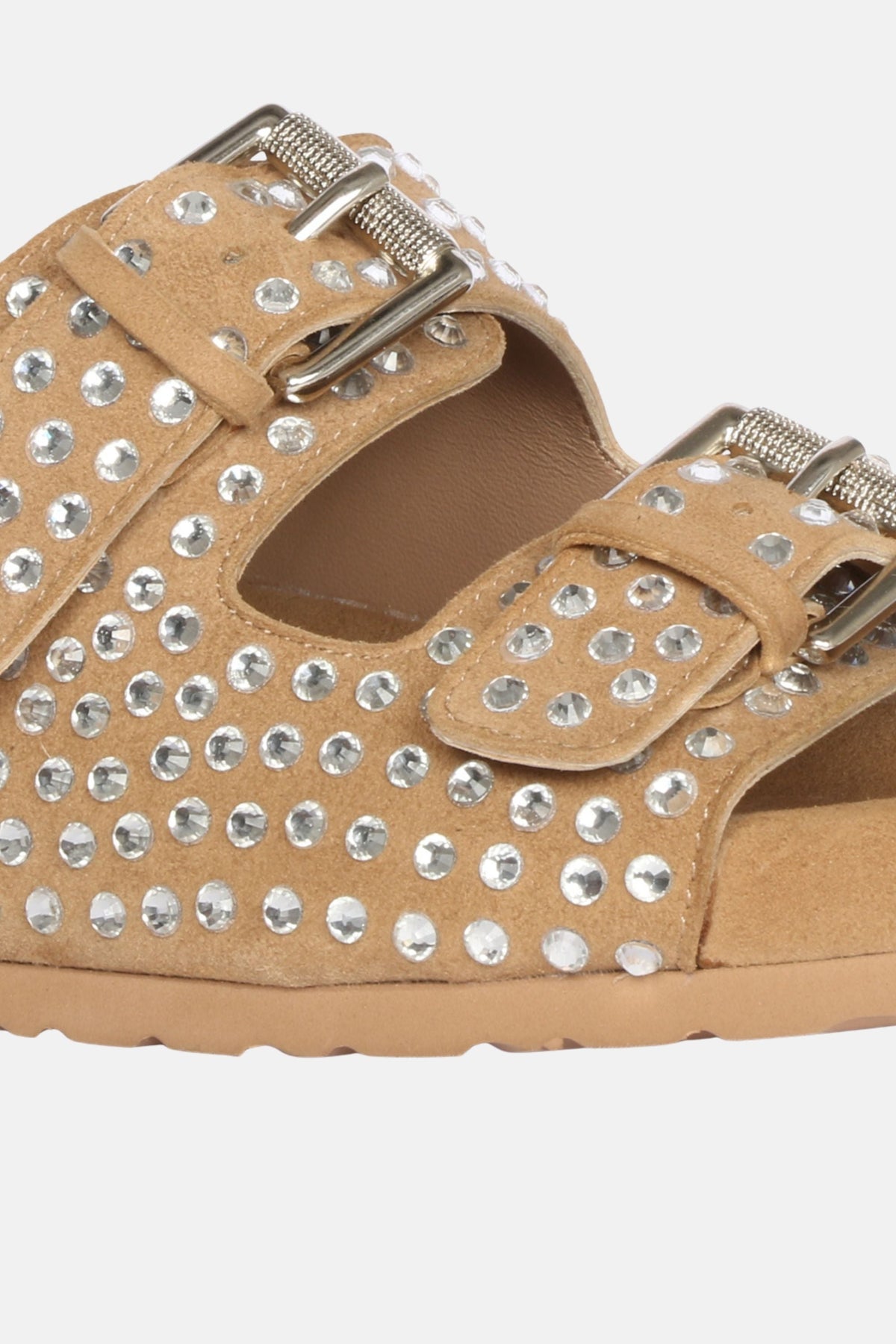 Show off your edgy side with our luxurious Riena beige leather Buckle Flat Sandals! Featuring studded details and gold buckle accents, perfect for strutting your stuff with confidence