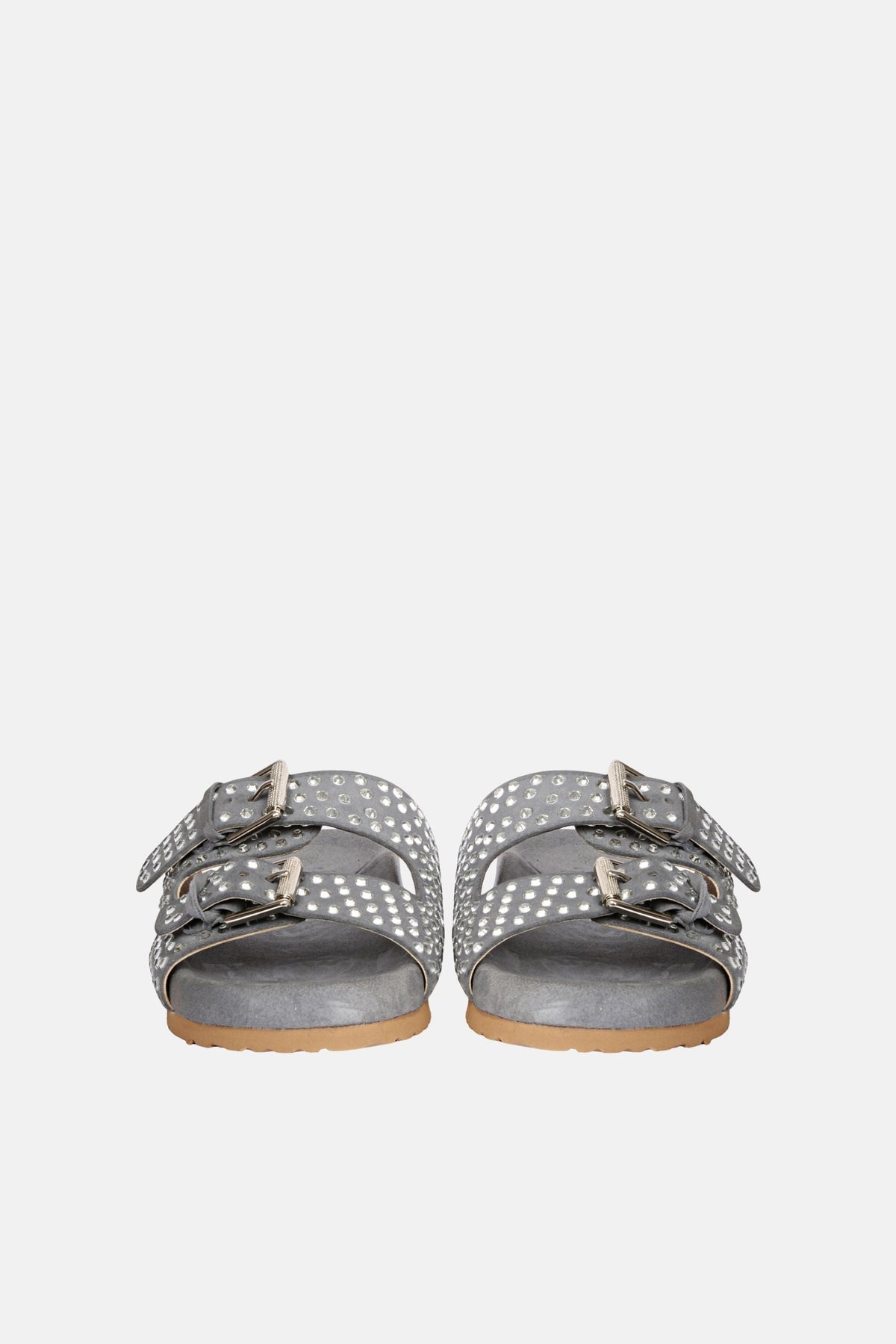 Show off your edgy side with our luxurious Riena blue leather Buckle Flat Sandals! Featuring studded details and gold buckle accents, perfect for strutting your stuff with confidence